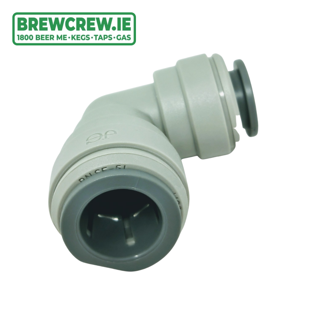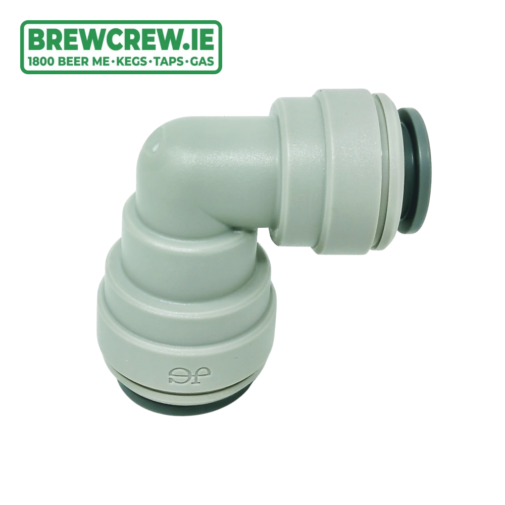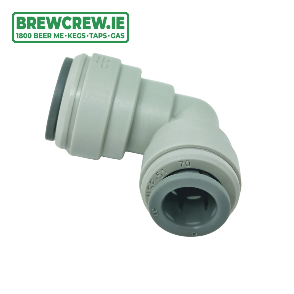 John Guest Reducing Elbow 1/2" Push Fit x 3/8" Push Fit, which is produced in a grey acetal copolymer making it especially suitable for applications involving potable liquids and foodstuffs.