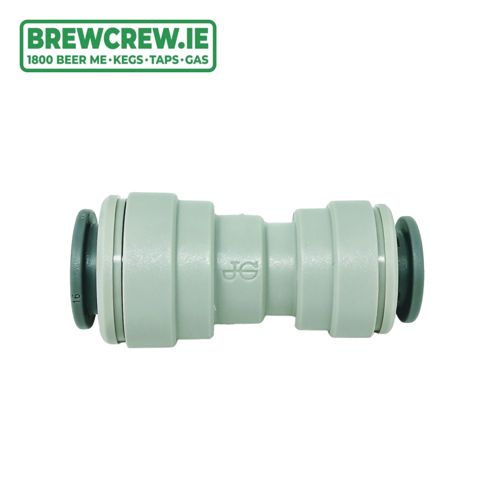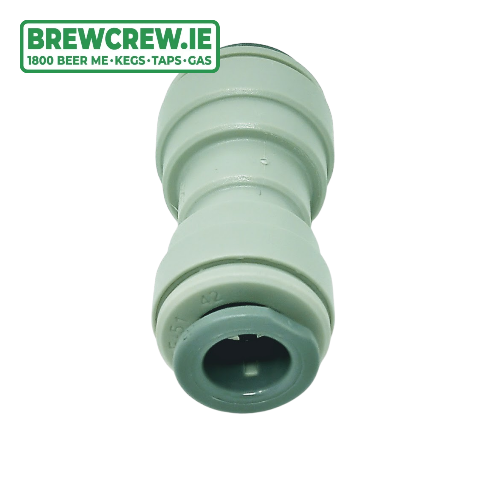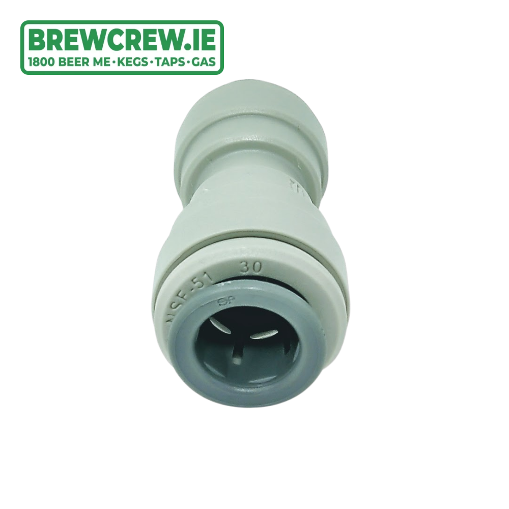 John Guest Reducing Straight Connector 3/8" to 5/16", which is produced in a grey acetal copolymer making it especially suitable for applications involving potable liquids and foodstuffs.